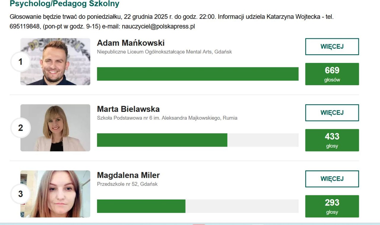 Z wielką radością informujemy, że nasza Pani psycholog Magdalena Miler zajęła trzecie miejsce w Plebiscycie Edukacyjnym organizowanym przez Dziennik Bałtycki w kategorii Psycholog/Pedagog szkolny.